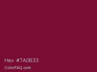 Hex #7a0b33 Color is a dark rose color and the nearest color is Siren #7a013a. Hex code #7a0b33 and RGB value is rgb(122,11,51). In RGB color space, this color is composed of 48% red, 4% green, 20% blue, In CMYK color space, this color is composed of 0% cyan, 91% magenta, 58% yellow , 52% black , In HSL color space, this color has a hue angle of 338° , 83% saturation and 26% lightness.