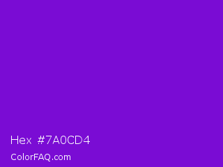 Hex #7a0cd4 Color is a normal purple color and the nearest color is French Violet #8806ce. Hex code #7a0cd4 and RGB value is rgb(122,12,212). In RGB color space, this color is composed of 48% red, 5% green, 83% blue, In CMYK color space, this color is composed of 42% cyan, 94% magenta, 0% yellow , 17% black , In HSL color space, this color has a hue angle of 273° , 89% saturation and 44% lightness.
