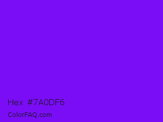 Hex #7a0df6 Color is a normal violet color and the nearest color is Violet Color Wheel #7f00ff. Hex code #7a0df6 and RGB value is rgb(122,13,246). In RGB color space, this color is composed of 48% red, 5% green, 96% blue, In CMYK color space, this color is composed of 50% cyan, 95% magenta, 0% yellow , 4% black , In HSL color space, this color has a hue angle of 268° , 93% saturation and 51% lightness.