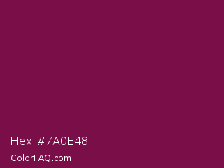 Hex #7a0e48 Color is a dark rose color and the nearest color is Rose Bud Cherry #800b47. Hex code #7a0e48 and RGB value is rgb(122,14,72). In RGB color space, this color is composed of 48% red, 5% green, 28% blue, In CMYK color space, this color is composed of 0% cyan, 89% magenta, 41% yellow , 52% black , In HSL color space, this color has a hue angle of 328° , 79% saturation and 27% lightness.