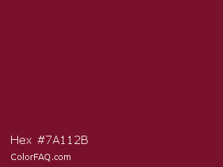 Hex #7a112b Color is a dark red color and the nearest color is Claret #7f1734. Hex code #7a112b and RGB value is rgb(122,17,43). In RGB color space, this color is composed of 48% red, 7% green, 17% blue, In CMYK color space, this color is composed of 0% cyan, 86% magenta, 65% yellow , 52% black , In HSL color space, this color has a hue angle of 345° , 76% saturation and 27% lightness.