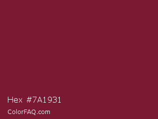 Hex #7a1931 Color is a dark red color and the nearest color is Claret #7f1734. Hex code #7a1931 and RGB value is rgb(122,25,49). In RGB color space, this color is composed of 48% red, 10% green, 19% blue, In CMYK color space, this color is composed of 0% cyan, 80% magenta, 60% yellow , 52% black , In HSL color space, this color has a hue angle of 345° , 66% saturation and 29% lightness.