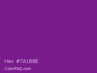 Hex #7a1b8e Color is a normal purple color and the nearest color is Seance #731e8f. Hex code #7a1b8e and RGB value is rgb(122,27,142). In RGB color space, this color is composed of 48% red, 11% green, 56% blue, In CMYK color space, this color is composed of 14% cyan, 81% magenta, 0% yellow , 44% black , In HSL color space, this color has a hue angle of 290° , 68% saturation and 33% lightness.