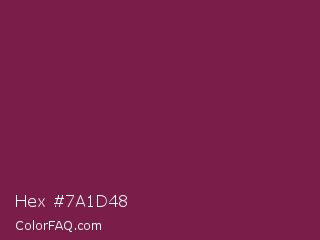 Hex #7a1d48 Color is a dark rose color and the nearest color is Pansy Purple #78184a. Hex code #7a1d48 and RGB value is rgb(122,29,72). In RGB color space, this color is composed of 48% red, 11% green, 28% blue, In CMYK color space, this color is composed of 0% cyan, 76% magenta, 41% yellow , 52% black , In HSL color space, this color has a hue angle of 332° , 62% saturation and 30% lightness.