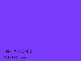 Hex #7a3afb Color is a light indigo color and the nearest color is Blue Violet #8a2be2. Hex code #7a3afb and RGB value is rgb(122,58,251). In RGB color space, this color is composed of 48% red, 23% green, 98% blue, In CMYK color space, this color is composed of 51% cyan, 77% magenta, 0% yellow , 2% black , In HSL color space, this color has a hue angle of 260° , 96% saturation and 61% lightness.