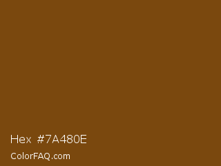 Hex #7a480e Color is a dark orange color and the nearest color is Raw Umber #734a12. Hex code #7a480e and RGB value is rgb(122,72,14). In RGB color space, this color is composed of 48% red, 28% green, 5% blue, In CMYK color space, this color is composed of 0% cyan, 41% magenta, 89% yellow , 52% black , In HSL color space, this color has a hue angle of 32° , 79% saturation and 27% lightness.