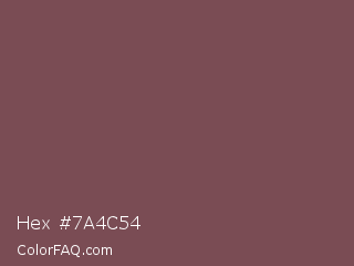 Hex #7a4c54 Color is a normal red color and the nearest color is Ferra #704f50. Hex code #7a4c54 and RGB value is rgb(122,76,84). In RGB color space, this color is composed of 48% red, 30% green, 33% blue, In CMYK color space, this color is composed of 0% cyan, 38% magenta, 31% yellow , 52% black , In HSL color space, this color has a hue angle of 350° , 23% saturation and 39% lightness.
