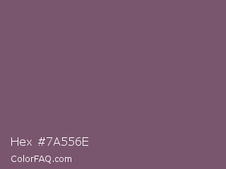 Hex #7a556e Color is a normal magenta color and the nearest color is Falcon #7f626d. Hex code #7a556e and RGB value is rgb(122,85,110). In RGB color space, this color is composed of 48% red, 33% green, 43% blue, In CMYK color space, this color is composed of 0% cyan, 30% magenta, 10% yellow , 52% black , In HSL color space, this color has a hue angle of 319° , 18% saturation and 41% lightness.