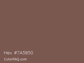 Hex #7a5850 Color is a normal red color and the nearest color is Roman Coffee #795d4c. Hex code #7a5850 and RGB value is rgb(122,88,80). In RGB color space, this color is composed of 48% red, 35% green, 31% blue, In CMYK color space, this color is composed of 0% cyan, 28% magenta, 34% yellow , 52% black , In HSL color space, this color has a hue angle of 11° , 21% saturation and 40% lightness.