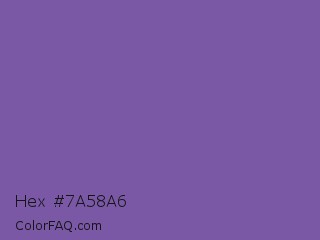 Hex #7a58a6 Color is a normal violet color and the nearest color is Royal Purple #7851a9. Hex code #7a58a6 and RGB value is rgb(122,88,166). In RGB color space, this color is composed of 48% red, 35% green, 65% blue, In CMYK color space, this color is composed of 27% cyan, 47% magenta, 0% yellow , 35% black , In HSL color space, this color has a hue angle of 266° , 31% saturation and 50% lightness.