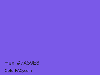 Hex #7a59e8 Color is a light indigo color and the nearest color is Medium Slate Blue #7b68ee. Hex code #7a59e8 and RGB value is rgb(122,89,232). In RGB color space, this color is composed of 48% red, 35% green, 91% blue, In CMYK color space, this color is composed of 47% cyan, 62% magenta, 0% yellow , 9% black , In HSL color space, this color has a hue angle of 254° , 76% saturation and 63% lightness.