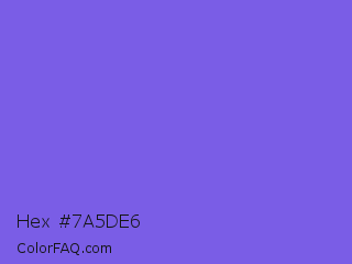Hex #7a5de6 Color is a light indigo color and the nearest color is Medium Slate Blue #7b68ee. Hex code #7a5de6 and RGB value is rgb(122,93,230). In RGB color space, this color is composed of 48% red, 36% green, 90% blue, In CMYK color space, this color is composed of 47% cyan, 60% magenta, 0% yellow , 10% black , In HSL color space, this color has a hue angle of 253° , 73% saturation and 63% lightness.