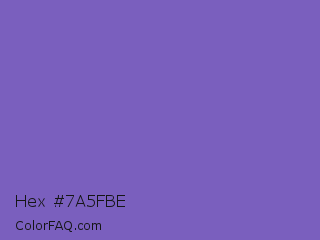 Hex #7a5fbe Color is a normal indigo color and the nearest color is Fuchsia Blue #7a58c1. Hex code #7a5fbe and RGB value is rgb(122,95,190). In RGB color space, this color is composed of 48% red, 37% green, 75% blue, In CMYK color space, this color is composed of 36% cyan, 50% magenta, 0% yellow , 25% black , In HSL color space, this color has a hue angle of 257° , 42% saturation and 56% lightness.
