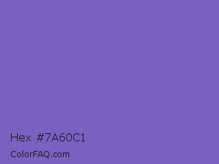 Hex #7a60c1 Color is a normal indigo color and the nearest color is Fuchsia Blue #7a58c1. Hex code #7a60c1 and RGB value is rgb(122,96,193). In RGB color space, this color is composed of 48% red, 38% green, 76% blue, In CMYK color space, this color is composed of 37% cyan, 50% magenta, 0% yellow , 24% black , In HSL color space, this color has a hue angle of 256° , 44% saturation and 57% lightness.