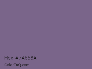 Hex #7a658a Color is a normal purple color and the nearest color is Rum #796989. Hex code #7a658a and RGB value is rgb(122,101,138). In RGB color space, this color is composed of 48% red, 40% green, 54% blue, In CMYK color space, this color is composed of 12% cyan, 27% magenta, 0% yellow , 46% black , In HSL color space, this color has a hue angle of 274° , 15% saturation and 47% lightness.