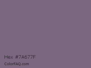 Hex #7a677f Color is a normal purple color and the nearest color is Old Lavender #796878. Hex code #7a677f and RGB value is rgb(122,103,127). In RGB color space, this color is composed of 48% red, 40% green, 50% blue, In CMYK color space, this color is composed of 4% cyan, 19% magenta, 0% yellow , 50% black , In HSL color space, this color has a hue angle of 288° , 10% saturation and 45% lightness.