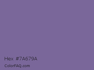 Hex #7a679a Color is a normal violet color and the nearest color is Kimberly #736c9f. Hex code #7a679a and RGB value is rgb(122,103,154). In RGB color space, this color is composed of 48% red, 40% green, 60% blue, In CMYK color space, this color is composed of 21% cyan, 33% magenta, 0% yellow , 40% black , In HSL color space, this color has a hue angle of 262° , 20% saturation and 50% lightness.
