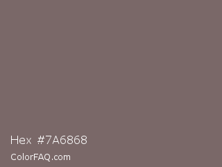 Hex #7a6868 Color is a normal red color and the nearest color is Sandstone #796d62. Hex code #7a6868 and RGB value is rgb(122,104,104). In RGB color space, this color is composed of 48% red, 41% green, 41% blue, In CMYK color space, this color is composed of 0% cyan, 15% magenta, 15% yellow , 52% black , In HSL color space, this color has a hue angle of 0° , 8% saturation and 44% lightness.