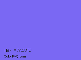 Hex #7a68f3 Color is a light indigo color and the nearest color is Medium Slate Blue #7b68ee. Hex code #7a68f3 and RGB value is rgb(122,104,243). In RGB color space, this color is composed of 48% red, 41% green, 95% blue, In CMYK color space, this color is composed of 50% cyan, 57% magenta, 0% yellow , 5% black , In HSL color space, this color has a hue angle of 248° , 85% saturation and 68% lightness.