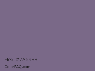 Hex #7a6988 Color is a normal purple color and the nearest color is Rum #796989. Hex code #7a6988 and RGB value is rgb(122,105,136). In RGB color space, this color is composed of 48% red, 41% green, 53% blue, In CMYK color space, this color is composed of 10% cyan, 23% magenta, 0% yellow , 47% black , In HSL color space, this color has a hue angle of 273° , 13% saturation and 47% lightness.