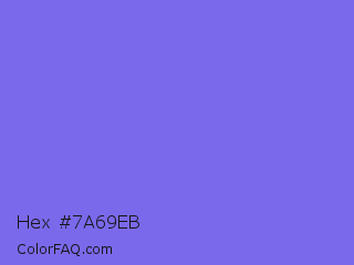 Hex #7a69eb Color is a light indigo color and the nearest color is Medium Slate Blue #7b68ee. Hex code #7a69eb and RGB value is rgb(122,105,235). In RGB color space, this color is composed of 48% red, 41% green, 92% blue, In CMYK color space, this color is composed of 48% cyan, 55% magenta, 0% yellow , 8% black , In HSL color space, this color has a hue angle of 248° , 76% saturation and 67% lightness.