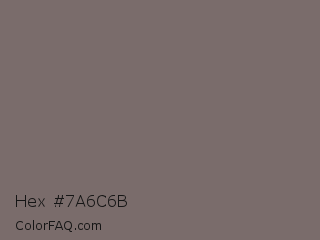 Hex #7a6c6b Color is a normal red color and the nearest color is Sandstone #796d62. Hex code #7a6c6b and RGB value is rgb(122,108,107). In RGB color space, this color is composed of 48% red, 42% green, 42% blue, In CMYK color space, this color is composed of 0% cyan, 11% magenta, 12% yellow , 52% black , In HSL color space, this color has a hue angle of 4° , 7% saturation and 45% lightness.