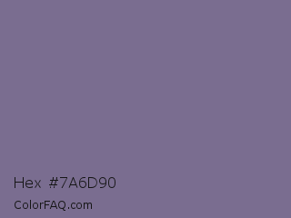 Hex #7a6d90 Color is a normal violet color and the nearest color is Rum #796989. Hex code #7a6d90 and RGB value is rgb(122,109,144). In RGB color space, this color is composed of 48% red, 43% green, 56% blue, In CMYK color space, this color is composed of 15% cyan, 24% magenta, 0% yellow , 44% black , In HSL color space, this color has a hue angle of 262° , 14% saturation and 50% lightness.
