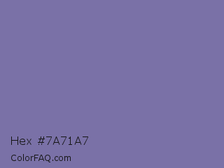 Hex #7a71a7 Color is a normal indigo color and the nearest color is Kimberly #736c9f. Hex code #7a71a7 and RGB value is rgb(122,113,167). In RGB color space, this color is composed of 48% red, 44% green, 65% blue, In CMYK color space, this color is composed of 27% cyan, 32% magenta, 0% yellow , 35% black , In HSL color space, this color has a hue angle of 250° , 23% saturation and 55% lightness.