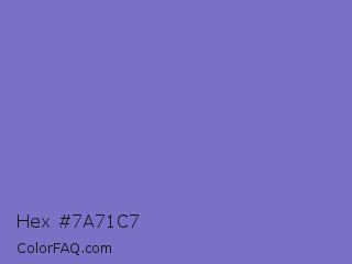 Hex #7a71c7 Color is a light indigo color and the nearest color is Toolbox #746cc0. Hex code #7a71c7 and RGB value is rgb(122,113,199). In RGB color space, this color is composed of 48% red, 44% green, 78% blue, In CMYK color space, this color is composed of 39% cyan, 43% magenta, 0% yellow , 22% black , In HSL color space, this color has a hue angle of 246° , 43% saturation and 61% lightness.