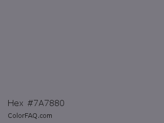 Hex #7a7880 Color is a normal indigo color and the nearest color is Jumbo #7c7b82. Hex code #7a7880 and RGB value is rgb(122,120,128). In RGB color space, this color is composed of 48% red, 47% green, 50% blue, In CMYK color space, this color is composed of 5% cyan, 6% magenta, 0% yellow , 50% black , In HSL color space, this color has a hue angle of 255° , 3% saturation and 49% lightness.