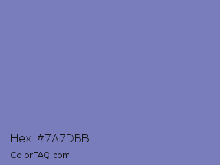 Hex #7a7dbb Color is a light blue color and the nearest color is Wild Blue Yonder #7a89b8. Hex code #7a7dbb and RGB value is rgb(122,125,187). In RGB color space, this color is composed of 48% red, 49% green, 73% blue, In CMYK color space, this color is composed of 35% cyan, 33% magenta, 0% yellow , 27% black , In HSL color space, this color has a hue angle of 237° , 32% saturation and 61% lightness.