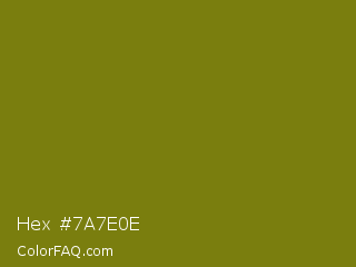 Hex #7a7e0e Color is a dark yellow color and the nearest color is Olive #808000. Hex code #7a7e0e and RGB value is rgb(122,126,14). In RGB color space, this color is composed of 48% red, 49% green, 5% blue, In CMYK color space, this color is composed of 3% cyan, 0% magenta, 89% yellow , 51% black , In HSL color space, this color has a hue angle of 62° , 80% saturation and 27% lightness.