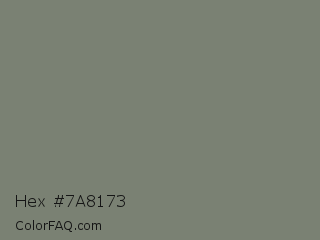 Hex #7a8173 Color is a normal green color and the nearest color is Smoke #738276. Hex code #7a8173 and RGB value is rgb(122,129,115). In RGB color space, this color is composed of 48% red, 51% green, 45% blue, In CMYK color space, this color is composed of 5% cyan, 0% magenta, 11% yellow , 49% black , In HSL color space, this color has a hue angle of 90° , 6% saturation and 48% lightness.