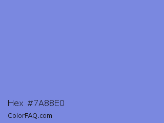 Hex #7a88e0 Color is a light blue color and the nearest color is Chetwode Blue #8581d9. Hex code #7a88e0 and RGB value is rgb(122,136,224). In RGB color space, this color is composed of 48% red, 53% green, 88% blue, In CMYK color space, this color is composed of 46% cyan, 39% magenta, 0% yellow , 12% black , In HSL color space, this color has a hue angle of 232° , 62% saturation and 68% lightness.