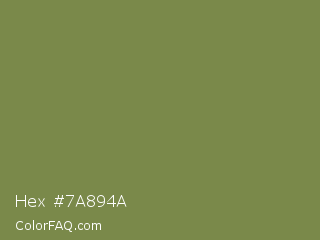 Hex #7a894a Color is a normal lime color and the nearest color is Palm Leaf #6f9940. Hex code #7a894a and RGB value is rgb(122,137,74). In RGB color space, this color is composed of 48% red, 54% green, 29% blue, In CMYK color space, this color is composed of 11% cyan, 0% magenta, 46% yellow , 46% black , In HSL color space, this color has a hue angle of 74° , 30% saturation and 41% lightness.
