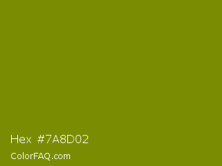 Hex #7a8d02 Color is a dark yellow color and the nearest color is Olive #808000. Hex code #7a8d02 and RGB value is rgb(122,141,2). In RGB color space, this color is composed of 48% red, 55% green, 1% blue, In CMYK color space, this color is composed of 13% cyan, 0% magenta, 99% yellow , 45% black , In HSL color space, this color has a hue angle of 68° , 97% saturation and 28% lightness.