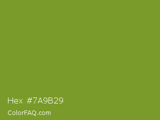 Hex #7a9b29 Color is a normal lime color and the nearest color is Wasabi #788a25. Hex code #7a9b29 and RGB value is rgb(122,155,41). In RGB color space, this color is composed of 48% red, 61% green, 16% blue, In CMYK color space, this color is composed of 21% cyan, 0% magenta, 74% yellow , 39% black , In HSL color space, this color has a hue angle of 77° , 58% saturation and 38% lightness.