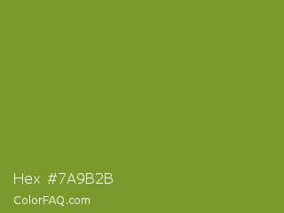 Hex #7a9b2b Color is a normal lime color and the nearest color is Wasabi #788a25. Hex code #7a9b2b and RGB value is rgb(122,155,43). In RGB color space, this color is composed of 48% red, 61% green, 17% blue, In CMYK color space, this color is composed of 21% cyan, 0% magenta, 72% yellow , 39% black , In HSL color space, this color has a hue angle of 78° , 57% saturation and 39% lightness.