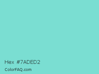 Hex #7aded2 Color is a light cyan color and the nearest color is Bermuda #7dd8c6. Hex code #7aded2 and RGB value is rgb(122,222,210). In RGB color space, this color is composed of 48% red, 87% green, 82% blue, In CMYK color space, this color is composed of 45% cyan, 0% magenta, 5% yellow , 13% black , In HSL color space, this color has a hue angle of 173° , 60% saturation and 67% lightness.