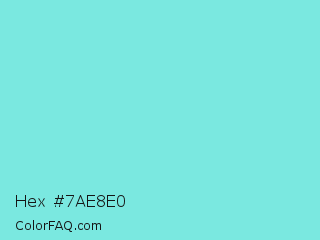 Hex #7ae8e0 Color is a light cyan color and the nearest color is Spray #79deec. Hex code #7ae8e0 and RGB value is rgb(122,232,224). In RGB color space, this color is composed of 48% red, 91% green, 88% blue, In CMYK color space, this color is composed of 47% cyan, 0% magenta, 3% yellow , 9% black , In HSL color space, this color has a hue angle of 176° , 71% saturation and 69% lightness.