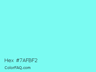 Hex #7afbf2 Color is a light cyan color and the nearest color is Electric Blue #7df9ff. Hex code #7afbf2 and RGB value is rgb(122,251,242). In RGB color space, this color is composed of 48% red, 98% green, 95% blue, In CMYK color space, this color is composed of 51% cyan, 0% magenta, 4% yellow , 2% black , In HSL color space, this color has a hue angle of 176° , 94% saturation and 73% lightness.
