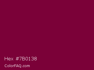 Hex #7b0138 Color is a dark rose color and the nearest color is Siren #7a013a. Hex code #7b0138 and RGB value is rgb(123,1,56). In RGB color space, this color is composed of 48% red, 0% green, 22% blue, In CMYK color space, this color is composed of 0% cyan, 99% magenta, 54% yellow , 52% black , In HSL color space, this color has a hue angle of 333° , 98% saturation and 24% lightness.