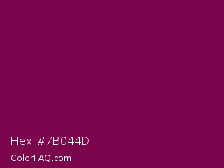 Hex #7b044d Color is a dark magenta color and the nearest color is Rose Bud Cherry #800b47. Hex code #7b044d and RGB value is rgb(123,4,77). In RGB color space, this color is composed of 48% red, 2% green, 30% blue, In CMYK color space, this color is composed of 0% cyan, 97% magenta, 37% yellow , 52% black , In HSL color space, this color has a hue angle of 323° , 94% saturation and 25% lightness.