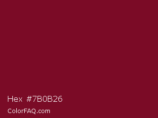Hex #7b0b26 Color is a dark red color and the nearest color is Burgundy #800020. Hex code #7b0b26 and RGB value is rgb(123,11,38). In RGB color space, this color is composed of 48% red, 4% green, 15% blue, In CMYK color space, this color is composed of 0% cyan, 91% magenta, 69% yellow , 52% black , In HSL color space, this color has a hue angle of 346° , 84% saturation and 26% lightness.