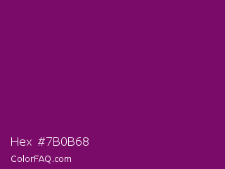 Hex #7b0b68 Color is a dark magenta color and the nearest color is Cardinal Pink #8c055e. Hex code #7b0b68 and RGB value is rgb(123,11,104). In RGB color space, this color is composed of 48% red, 4% green, 41% blue, In CMYK color space, this color is composed of 0% cyan, 91% magenta, 15% yellow , 52% black , In HSL color space, this color has a hue angle of 310° , 84% saturation and 26% lightness.