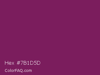 Hex #7b1d5d Color is a dark magenta color and the nearest color is French Plum #811453. Hex code #7b1d5d and RGB value is rgb(123,29,93). In RGB color space, this color is composed of 48% red, 11% green, 36% blue, In CMYK color space, this color is composed of 0% cyan, 76% magenta, 24% yellow , 52% black , In HSL color space, this color has a hue angle of 319° , 62% saturation and 30% lightness.