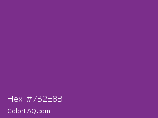 Hex #7b2e8b Color is a normal purple color and the nearest color is Vivid Violet #803790. Hex code #7b2e8b and RGB value is rgb(123,46,139). In RGB color space, this color is composed of 48% red, 18% green, 55% blue, In CMYK color space, this color is composed of 12% cyan, 67% magenta, 0% yellow , 45% black , In HSL color space, this color has a hue angle of 290° , 50% saturation and 36% lightness.