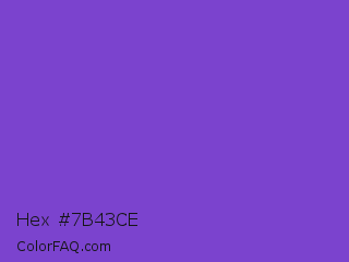 Hex #7b43ce Color is a normal violet color and the nearest color is Fuchsia Blue #7a58c1. Hex code #7b43ce and RGB value is rgb(123,67,206). In RGB color space, this color is composed of 48% red, 26% green, 81% blue, In CMYK color space, this color is composed of 40% cyan, 67% magenta, 0% yellow , 19% black , In HSL color space, this color has a hue angle of 264° , 59% saturation and 54% lightness.
