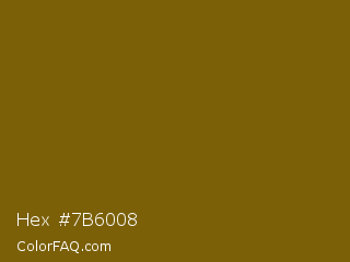 Hex #7b6008 Color is a dark yellow color and the nearest color is Yukon Gold #7b6608. Hex code #7b6008 and RGB value is rgb(123,96,8). In RGB color space, this color is composed of 48% red, 38% green, 3% blue, In CMYK color space, this color is composed of 0% cyan, 22% magenta, 93% yellow , 52% black , In HSL color space, this color has a hue angle of 46° , 88% saturation and 26% lightness.