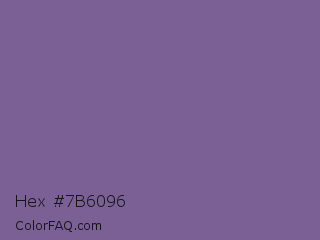 Hex #7b6096 Color is a normal violet color and the nearest color is French Lilac #86608e. Hex code #7b6096 and RGB value is rgb(123,96,150). In RGB color space, this color is composed of 48% red, 38% green, 59% blue, In CMYK color space, this color is composed of 18% cyan, 36% magenta, 0% yellow , 41% black , In HSL color space, this color has a hue angle of 270° , 22% saturation and 48% lightness.
